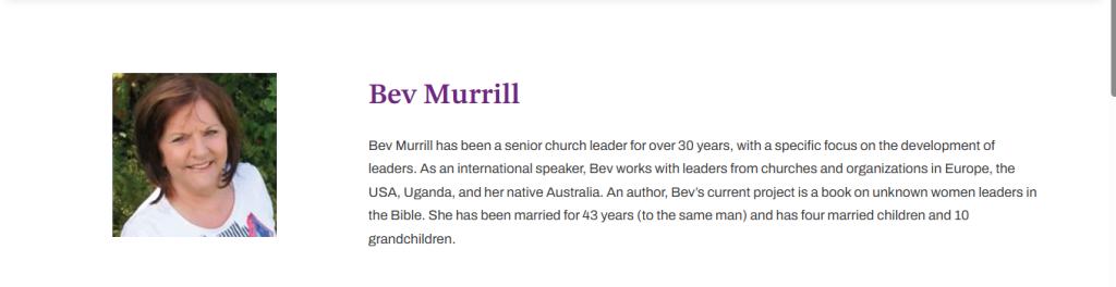 Bev Murrill is an influential British-Australian pastor, author, leadership mentor, and advocate for women in ministry. She is widely known for her work in empowering leaders, strengthening churches, and championing biblical equality. With decades of global ministry experience, Bev has become a respected voice in Christian leadership development, pastoral coaching, and organizational growth. Her ability to teach with clarity, compassion, and strength has made her a valued leader across the United Kingdom, Europe, Australia, and beyond.