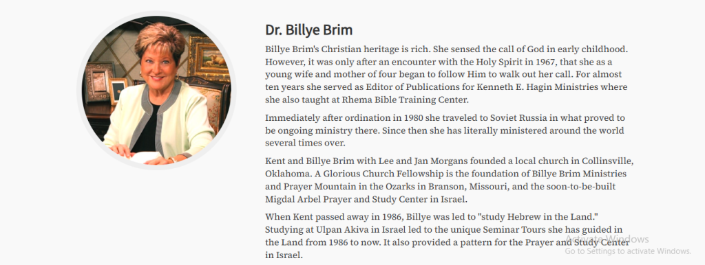 Billye Brim is a respected American Christian minister, author, Bible teacher, and global prayer leader whose ministry has influenced believers around the world for more than half a century. She is widely known for her teachings on intercession, biblical prophecy, spiritual authority, and revival. Through Billye Brim Ministries and her well-known Prayer Mountain gatherings, she has helped countless Christians grow in their relationship with God and understand the times through Scripture.