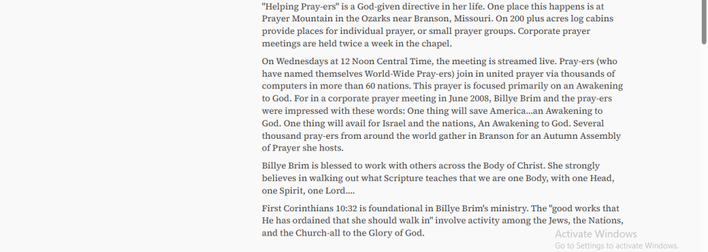 One of the most influential aspects of Billye Brim’s ministry is Prayer Mountain in the Ozarks, a spiritual retreat in Missouri designed as a place for focused prayer, worship, intercession, and prophetic gatherings.