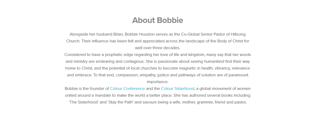 Bobbie Houston is also known for her focus on worship and creativity, contributing to Hillsong’s global identity as a hub for contemporary Christian music and culture.