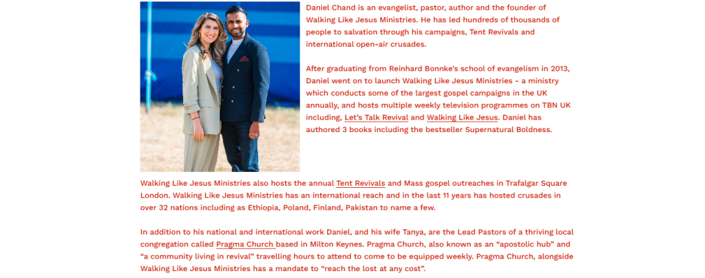 Daniel Chand is a prominent British evangelist, pastor, author, and founder of Walking Like Jesus Ministries, known for his dynamic preaching, international crusades, and televised ministry programs. Since launching his ministry, Chand has led hundreds of thousands of people to salvation through his campaigns, tent revivals, and open-air events. His influence extends across the UK and beyond, inspiring believers to embrace revival, bold evangelism, and spiritual transformation.