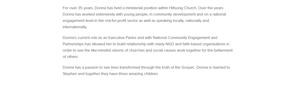 She is known for her long-term ministry leadership at Hillsong Church, community engagement, and speaking ministry.