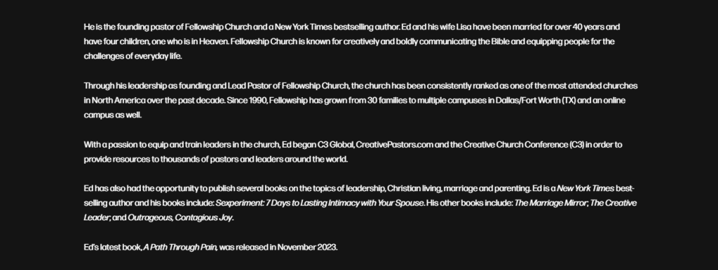Ed Young Jr.’s sermons, podcasts, and online content have a global audience. He effectively uses digital platforms to reach millions, providing spiritual guidance, inspiration, and practical advice for living a Christ-centered life.