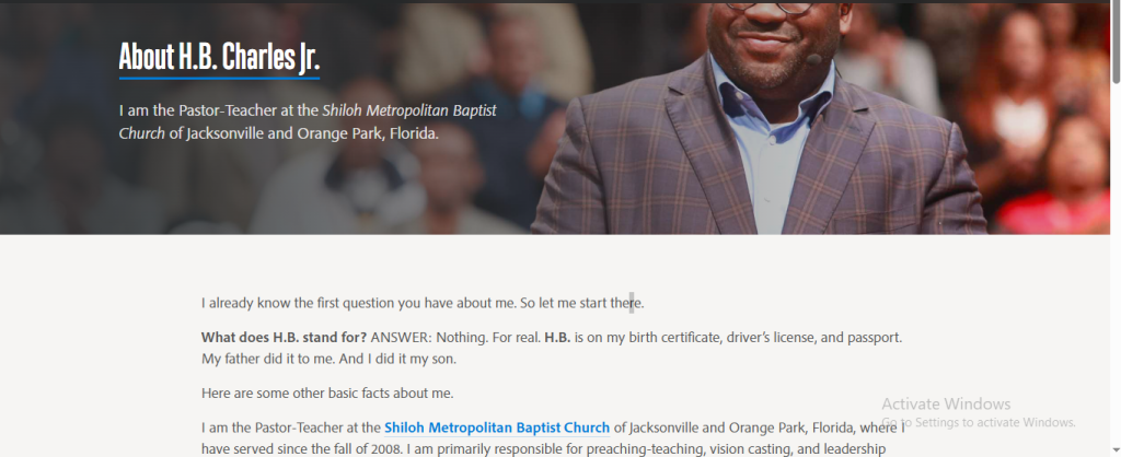 In 2008, Charles became the senior pastor of Shiloh Metropolitan Baptist Church in Jacksonville, Florida. Under his leadership, Shiloh has grown spiritually and numerically, becoming a multi-generational and multi-campus ministry known for Bible-centered teaching, community outreach, and strong worship services.
