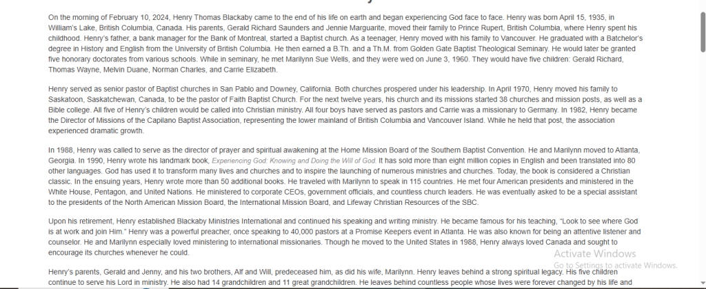 He founded Blackaby Ministries International, which continues to promote discipleship and spiritual renewal around the world.