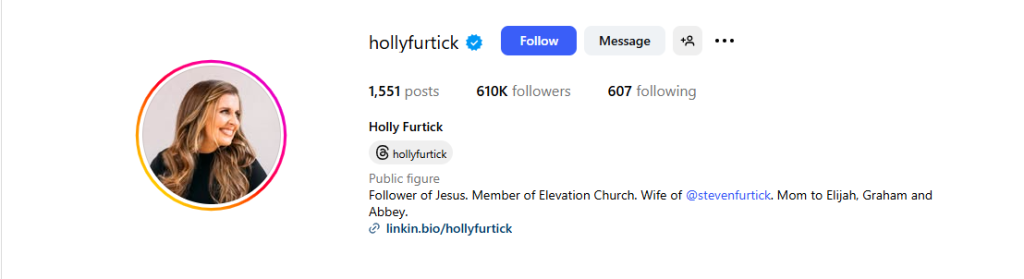 Outside of her ministry work, Holly Furtick is a dedicated wife, mother, and mentor. She maintains a strong presence on social media and digital platforms, where she shares encouraging messages, prayers, and teachings.