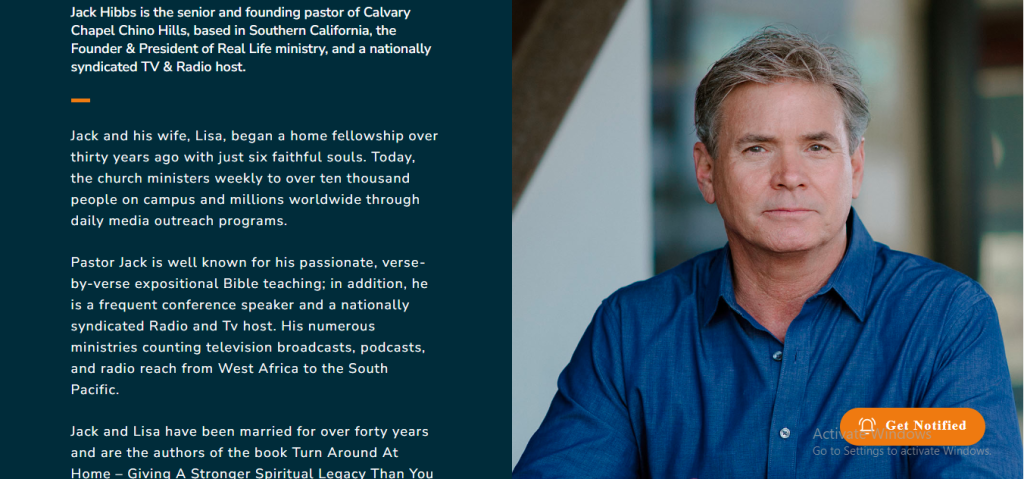 Jack Hibbs is the founding and senior pastor of Calvary Chapel Chino Hills, a multi-campus church located in Southern California. Under his leadership, the church has grown into one of the largest congregations in the region, attracting thousands of members weekly. The church offers services, Bible study programs, community outreach, and youth programs, all designed to foster spiritual growth and discipleship.