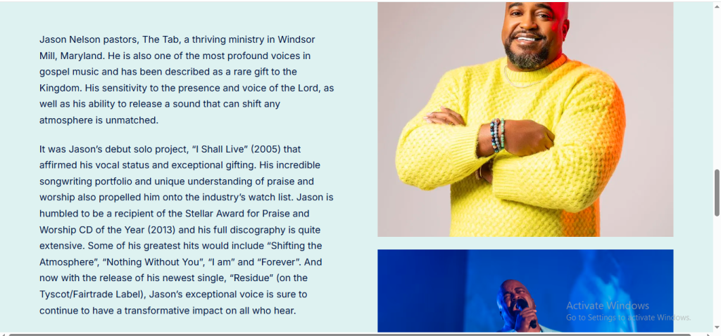 Alongside his music career, Jason Nelson served as the senior pastor of The Tabernacle at Greater Bethlehem Temple in Randallstown, Maryland, where he ministered for several years. His leadership focused on spiritual growth, prayer, worship, and community building.