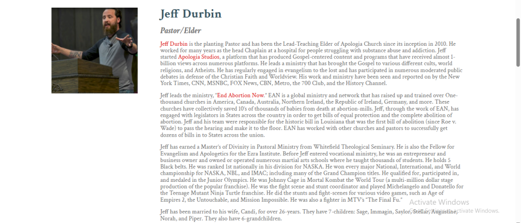 He is known for Christian apologetics, public debates, pro-life activism, and leading Apologia Church and Apologia Studios.