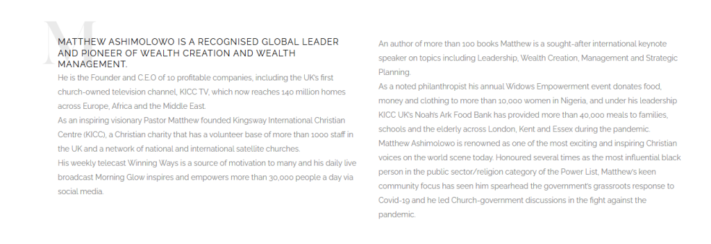 Pastor Matthew Ashimolowo is a Nigerian-British pastor, author, televangelist, and founder of Kingsway International Christian Centre (KICC) based in London.