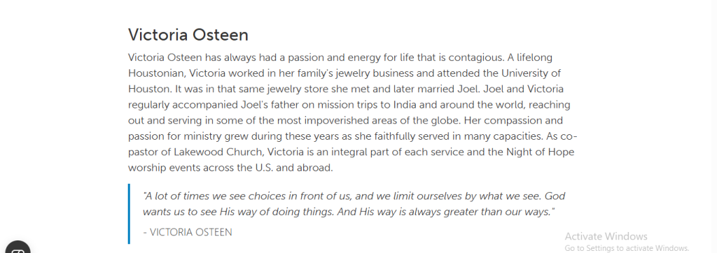 Victoria Osteen is a respected American pastor, author, speaker, and co-pastor of Lakewood Church in Houston, Texas, alongside her husband, Joel Osteen. She is known for her gentle spirit, inspirational teachings, and passion for helping others grow in faith, Victoria has become one of the most influential female voices in Christian ministry today. She is also a bestselling author whose books have encouraged millions of readers worldwide to embrace faith, confidence, and inner strength.
